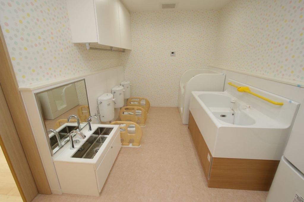 2階:2歳児用トイレ。トイレトレーニングが始まります。子供達がトイレに行きたくなるように、壁紙が可愛らしく、清潔感もあります。