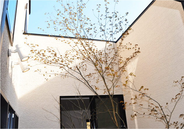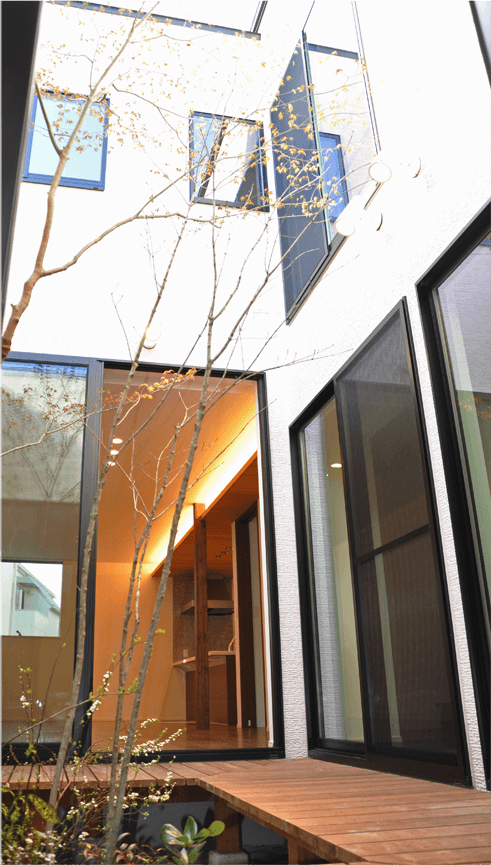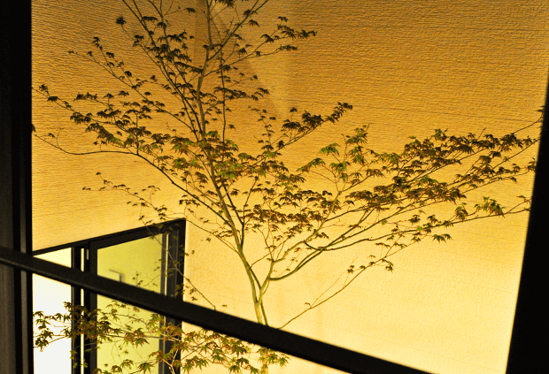 夜には庭をライトアップすることにより、昼とは違った雰囲気を演出します。インナーコートの壁に映る樹木の影や、浮かび上がる植栽がドラマティックな表情を見せてくれるでしょう。プライバシーが確保されているため、夜でも安心して窓を開け放つことが可能です。